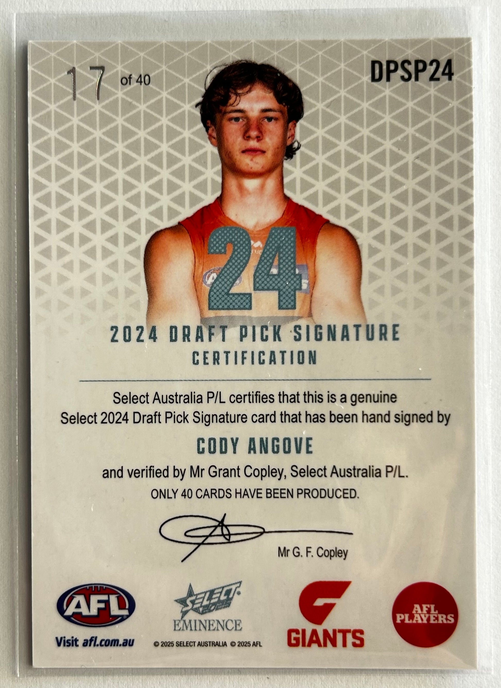 2025 AFL Select Eminence - CODY ANGOVE (GWS GIANTS) Draft Pick Signature Platinum /40 DPSP24